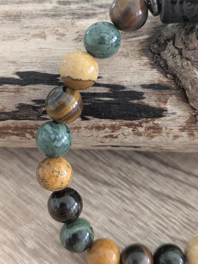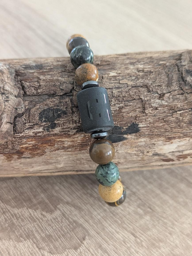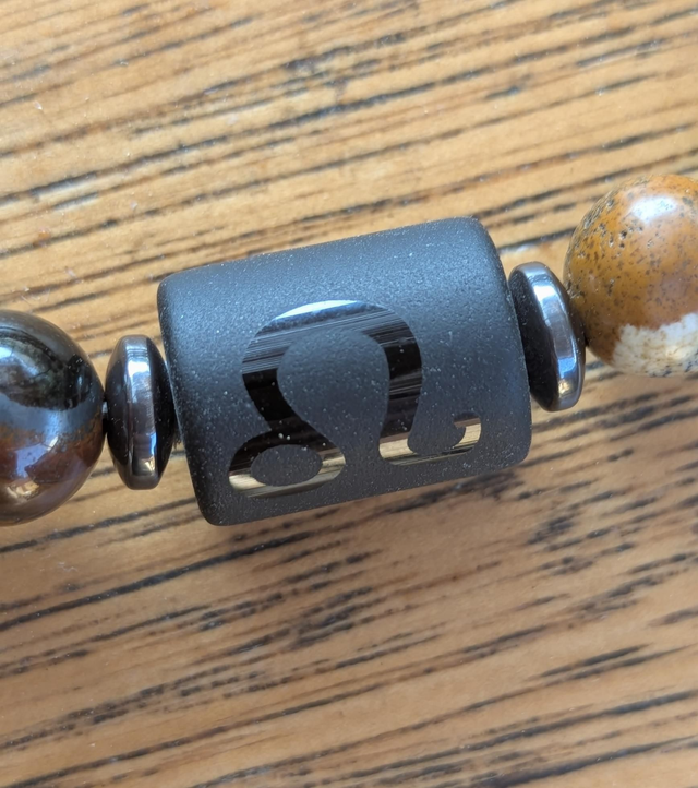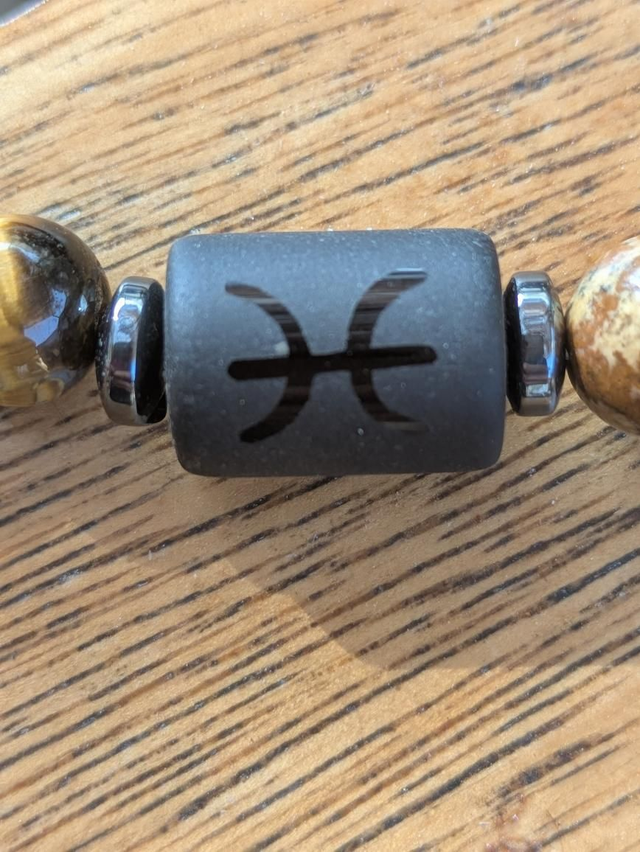 Bracelet composé de perles de jaspe paysage, de jaspe kambaba et d'oeil de tigre. La perle noire fantaisie est marquée du sigle du signe astrologique