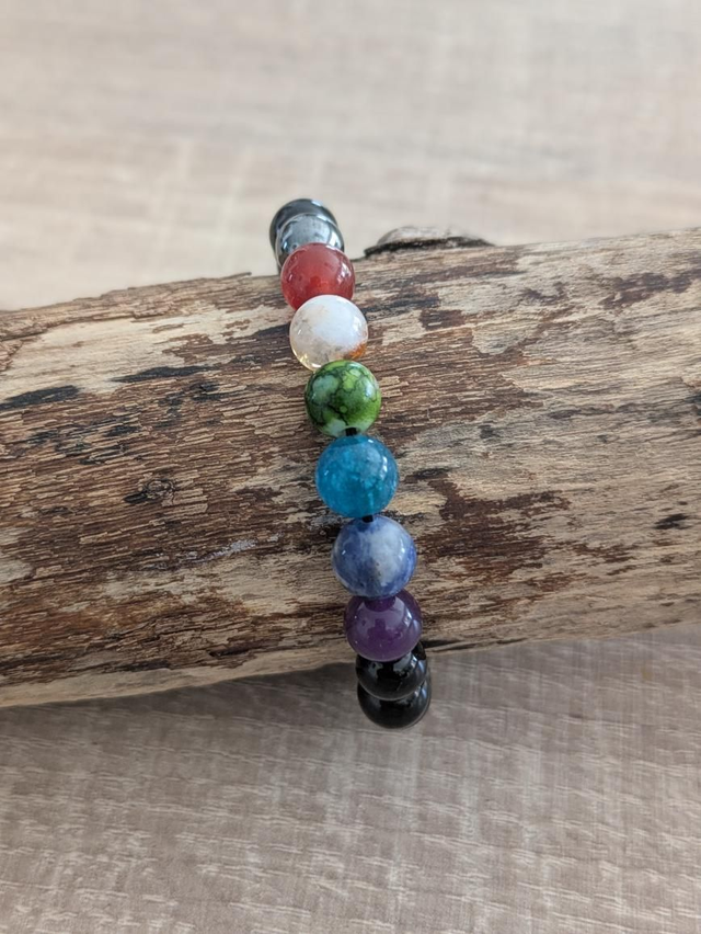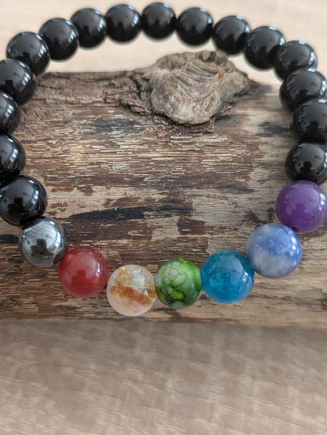 Bracelet 7 chakras composé d'obsidienne noire, hématite, grenat hessonite, citrine, jaspe vert, apatite, sodalite et améthyste.