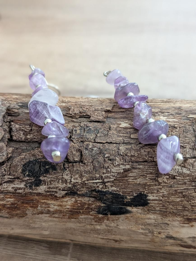 Boucles d'oreilles composées de petites pierres d'améthyste montées sur une petite tige argentée. Attache en argent S925.