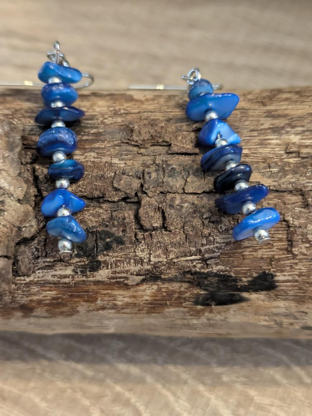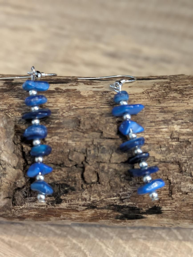Boucles d'oreilles composées de petites pierres de lapiz lasuli montées sur une petite tige argentée. Attache en argent S925.