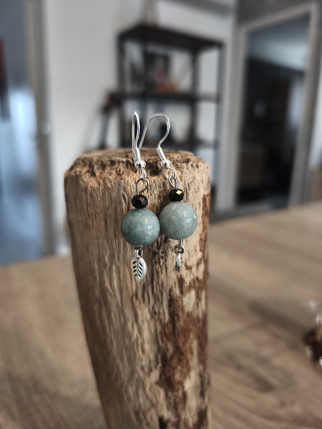 Boucles d'oreilles composées de perles de jade de Birmanie 10 mm, d'une perle fantaisie noire à facette et d'une breloque en forme de feuille.