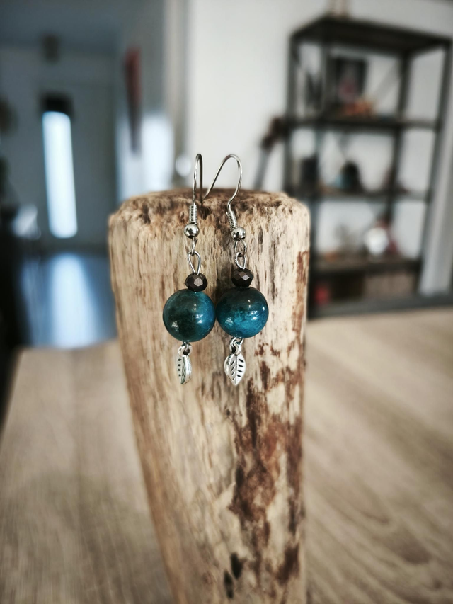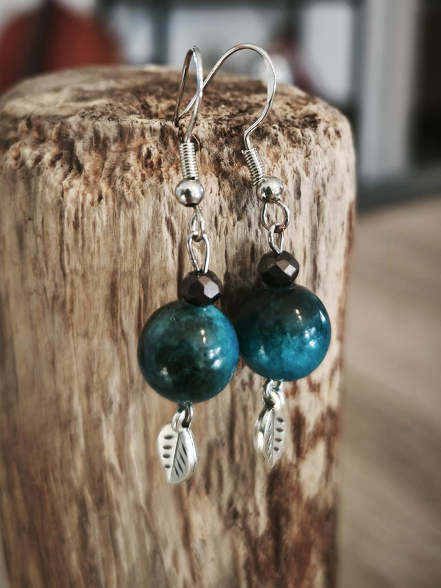 Boucles d'oreilles composées de perles en oeil de tigre turquoise, d'une perle fantaisie noire à facette et d'une breloque feuille argenté. L'attache est en argent S925.