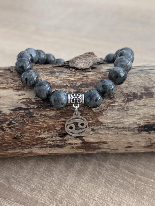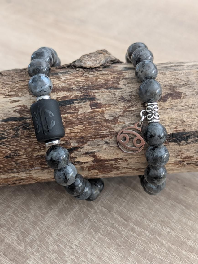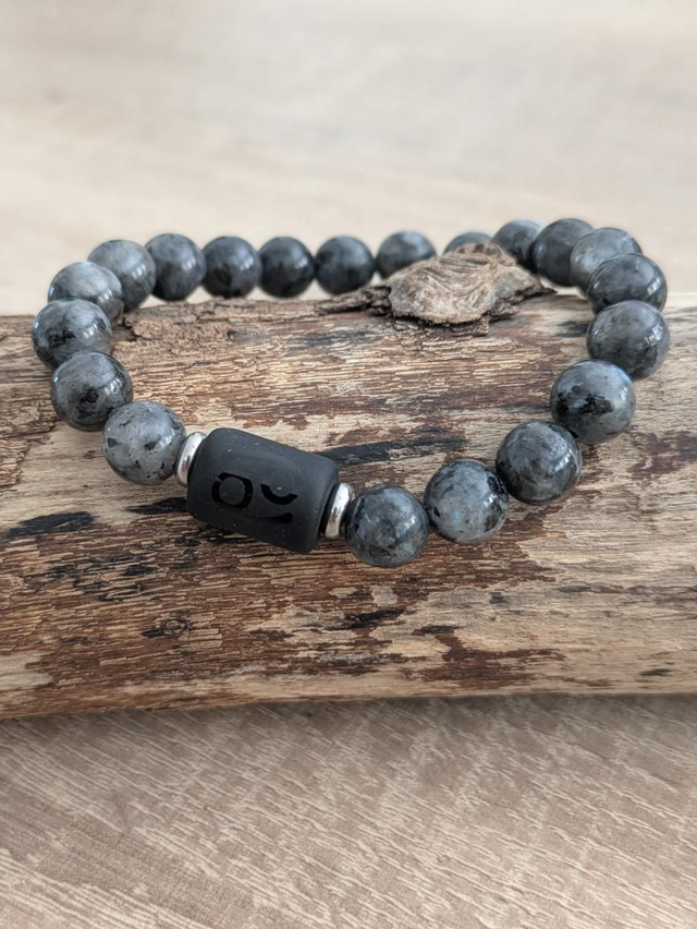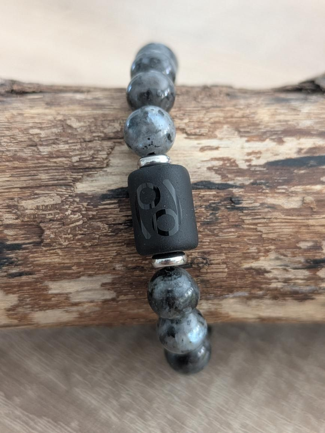 Bracelet en pierres de Larvikite aussi appelé labradorite Norvègienne ou labradorite noire. Monté avec une décoration du sigle du cancer au choix : perle noire ou breloque argentée