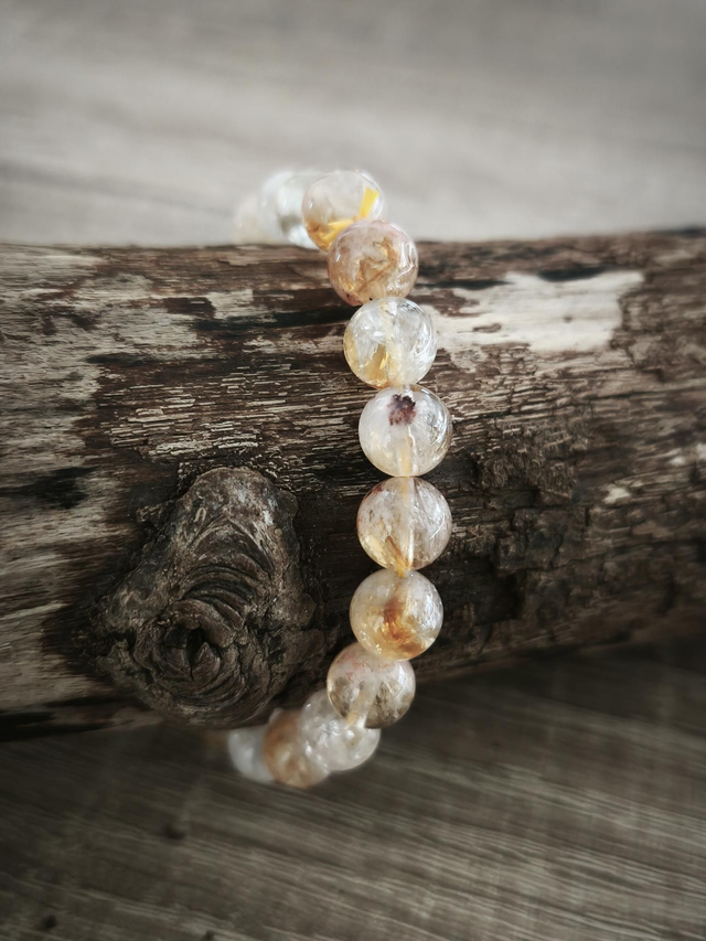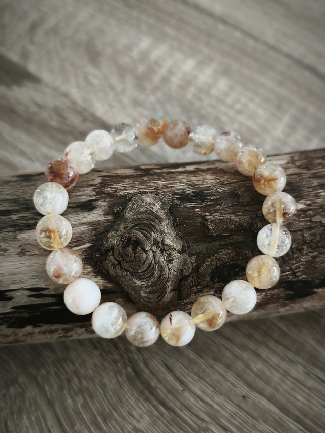 Magnifique bracelet en pierres naturelles de citrine jaune pâle mouchetées de blanc, d'orange ou de gris, pierres translucides montées sur un élastique. Citrine chauffée.