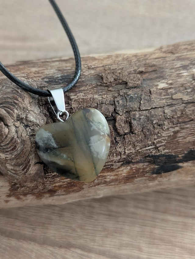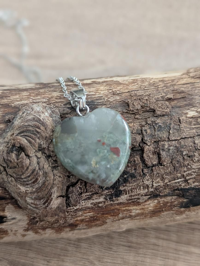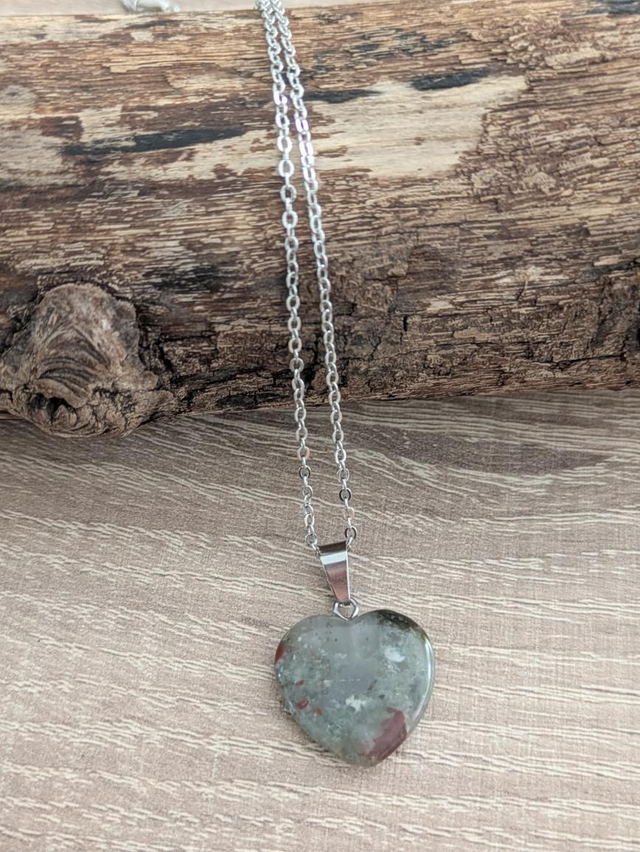 Pendentif coeur en pierre de sang. C'est une pierre semi transparentes qui présente de multitude de couleur allant du gris au rouge