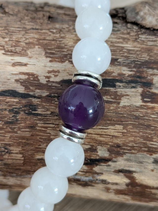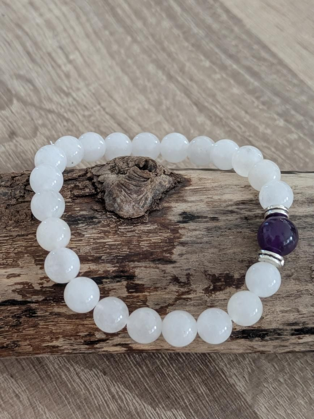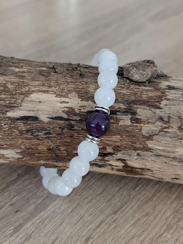 Magnifique bracelet composé de perles de pierres de lunes en 8 mm et d'une pierre d'améthyste 10 mm