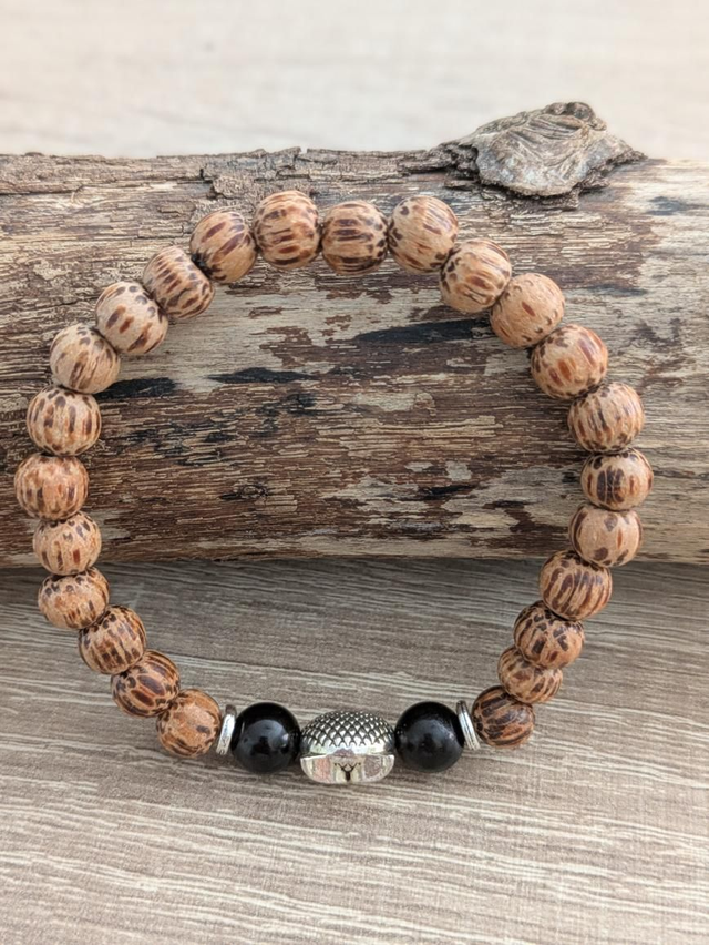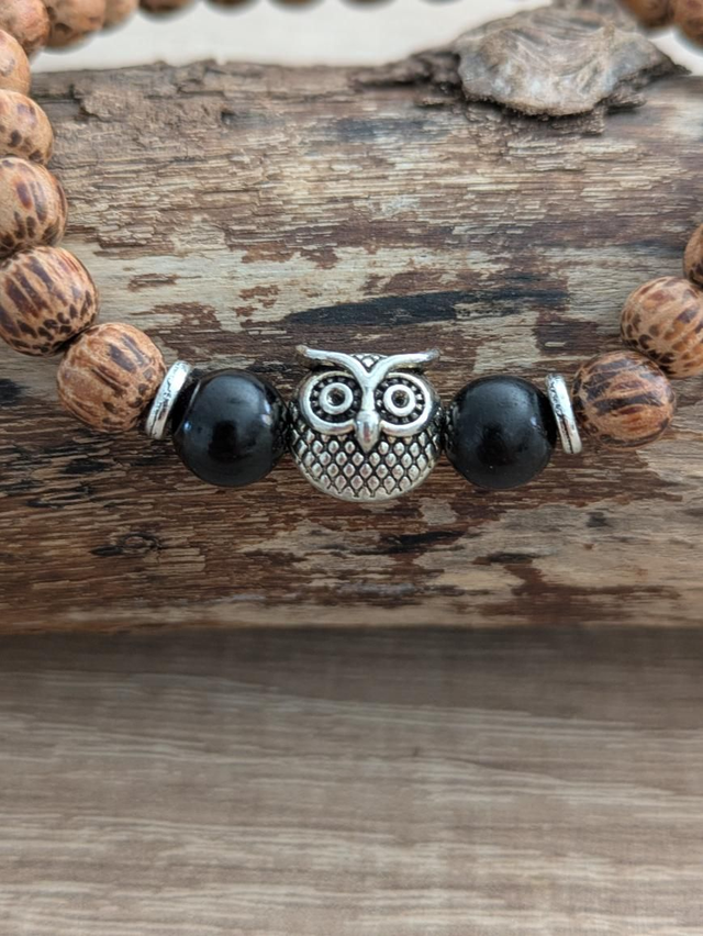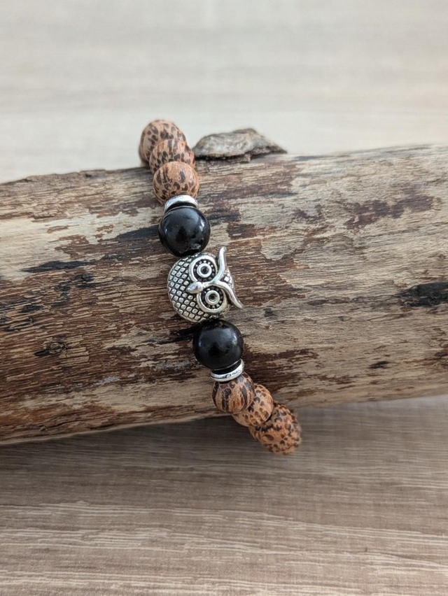 Bracelet en perles de bambou et bois noir, breloque hibou argenté