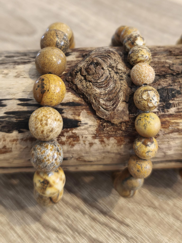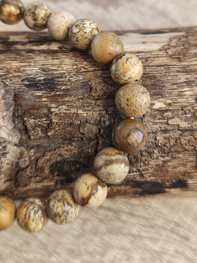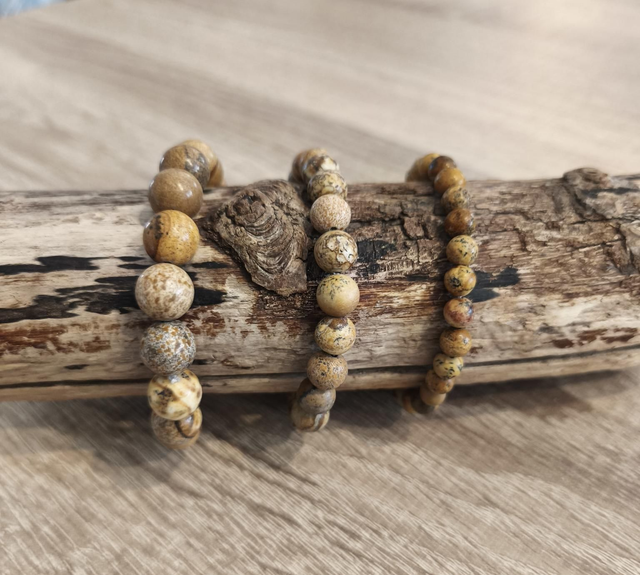 Bracelet en pierres naturelles de Jaspe paysage. Perles opaques aux couleurs naturelles beiges marrons.