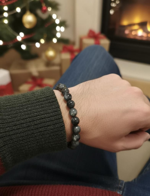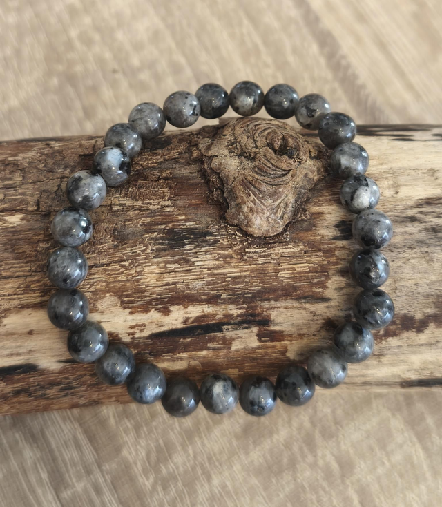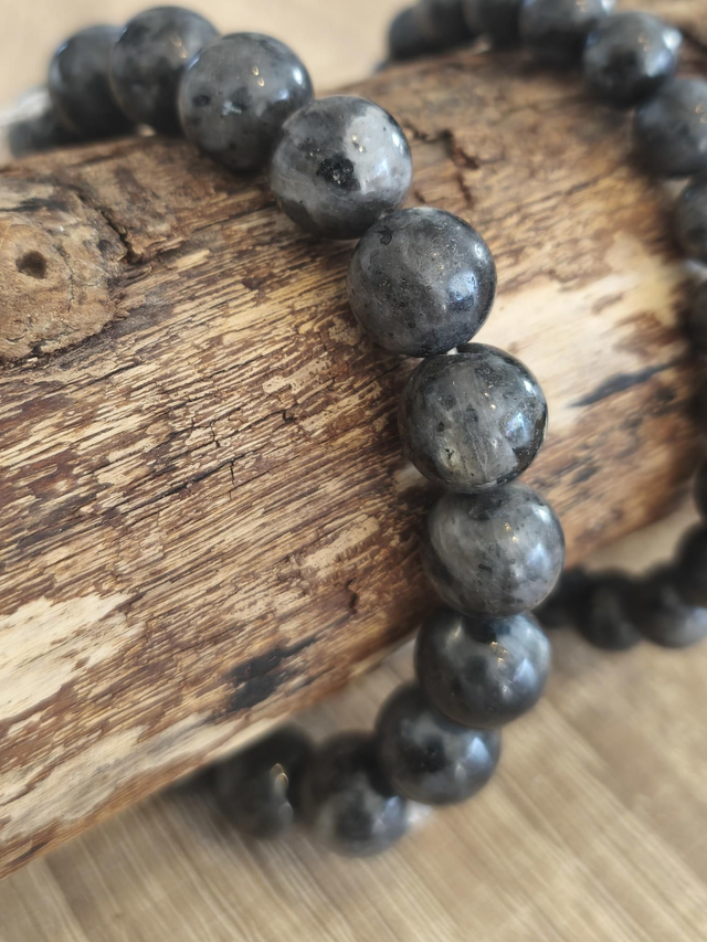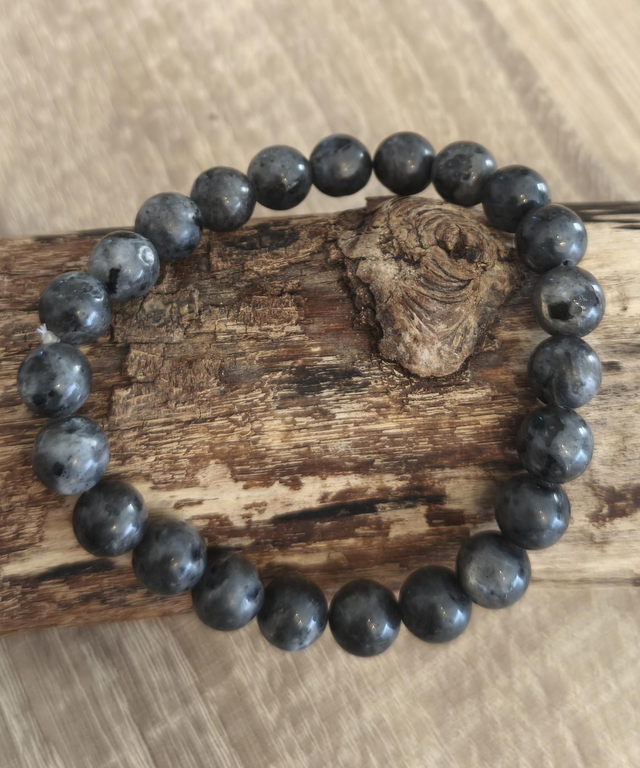 Bracelet en pierres naturelles de Larvikite aussi appelé labradorite Norvègienne ou labradorite noire.