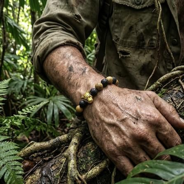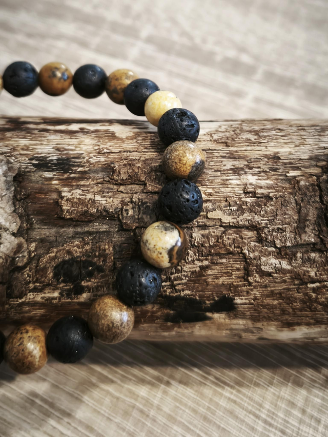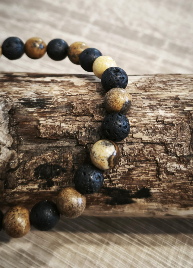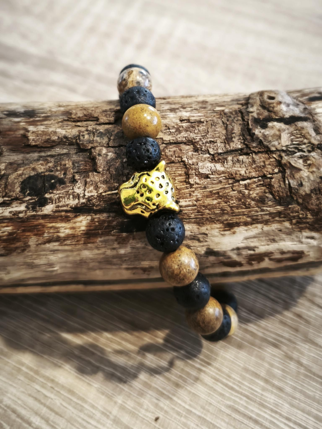 Bracelet original monté sur un élastique noir et composé de perles de Jaspe paysage, d'onyx noir mat et d'une décoration tête de léopard dorée.