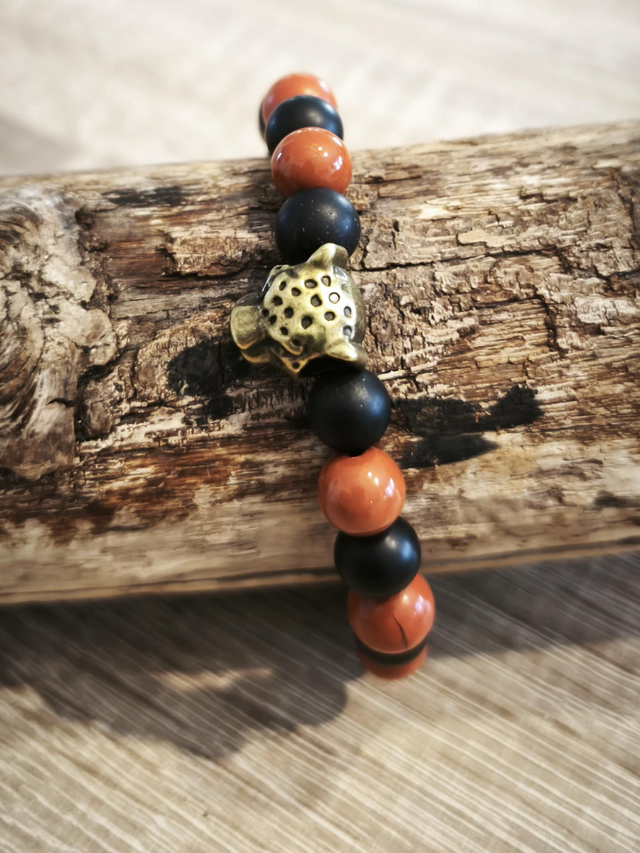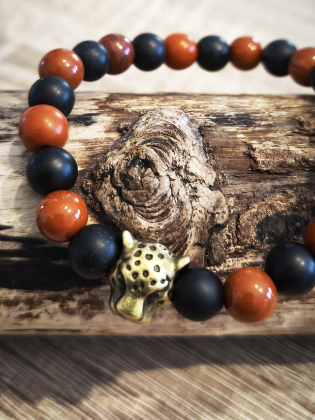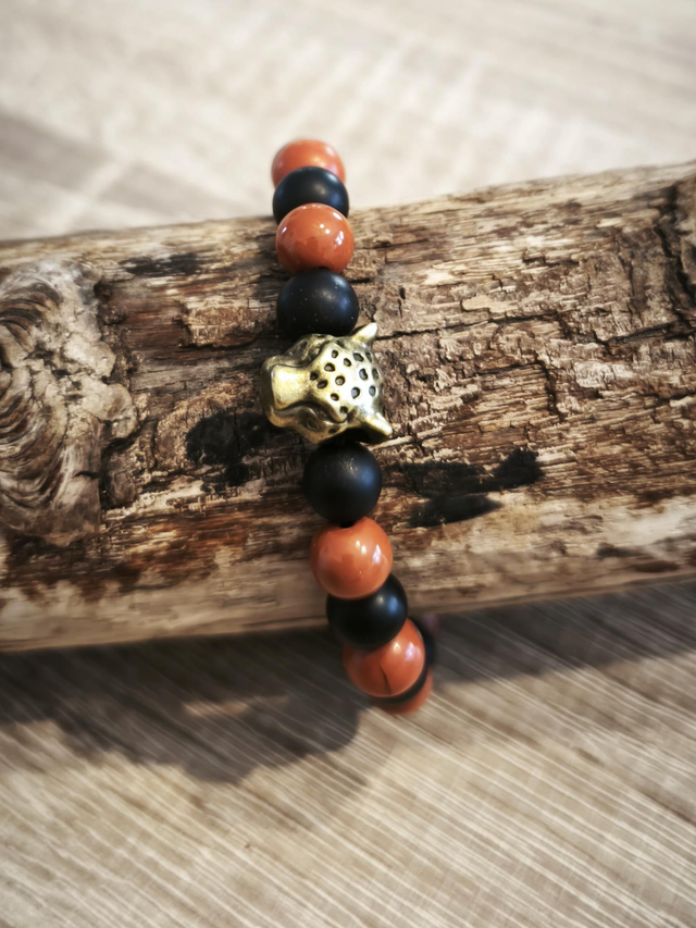 Bracelet original monté sur un élastique et composé de perles de Jaspe rouge, onyx noir mat et d'une décoration tête de léopard. Diamètre des perles: 8mm