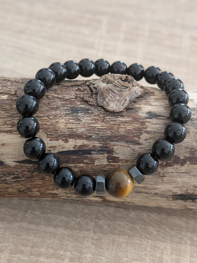 Bracelet en pierres d'obsidienne noire associée à une perle d'oeil de tigre et deux entretoises en hématite