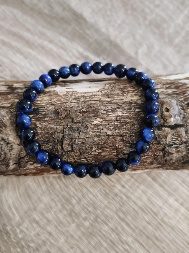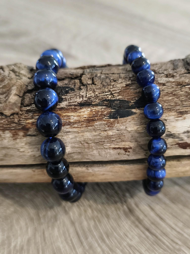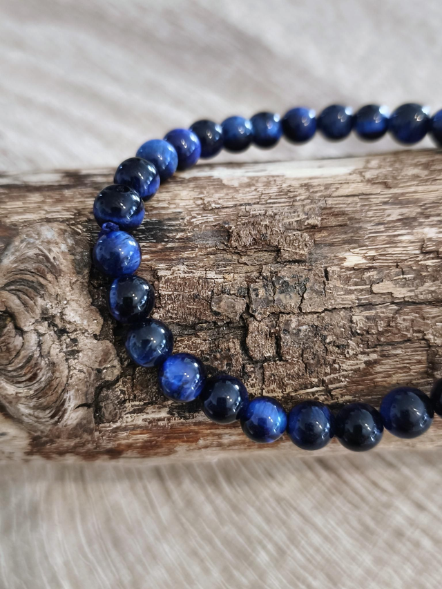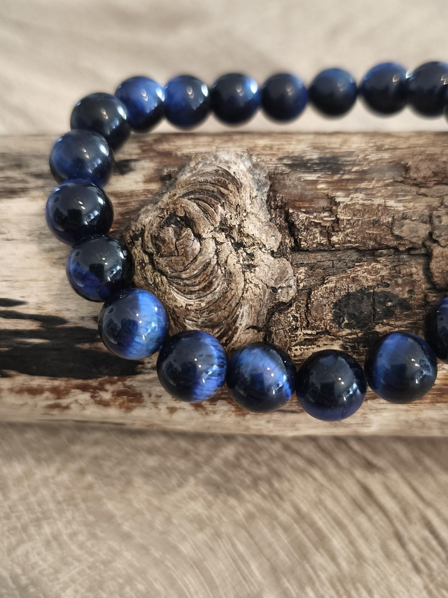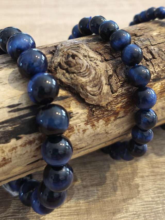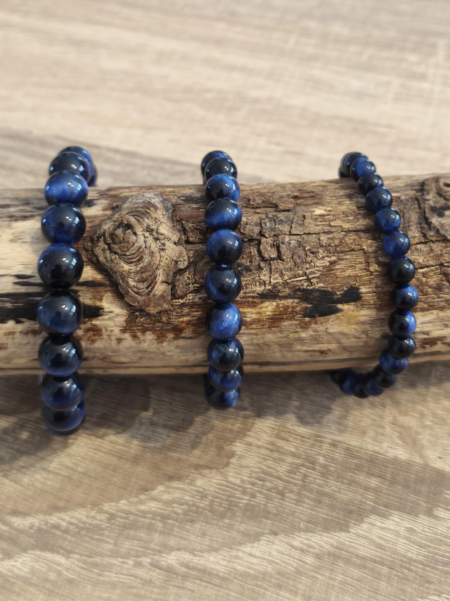 L'oeil de tigre bleu n'existe pas naturellement dans la nature, c'est à la base une pierre d'oeil de tigre qui à été teintée. Ce qui lui confère magnifiques reflets.