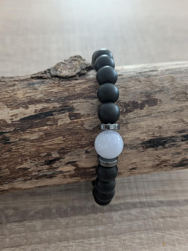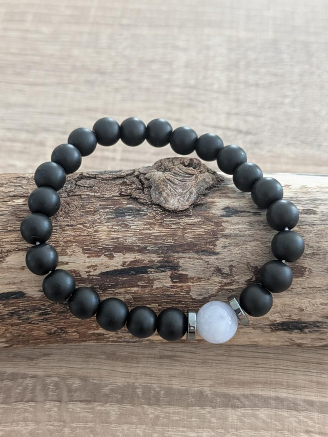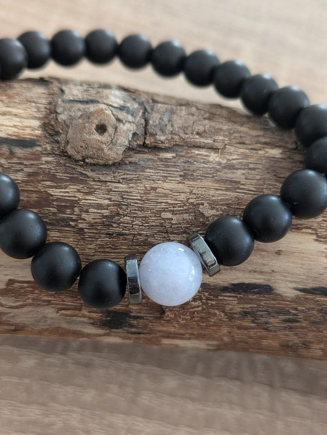 Bracelet en perles d'onyx noir mat en 8mm accompagné d'une perle 10 mm en pierre de lune. Entretoises en hématite