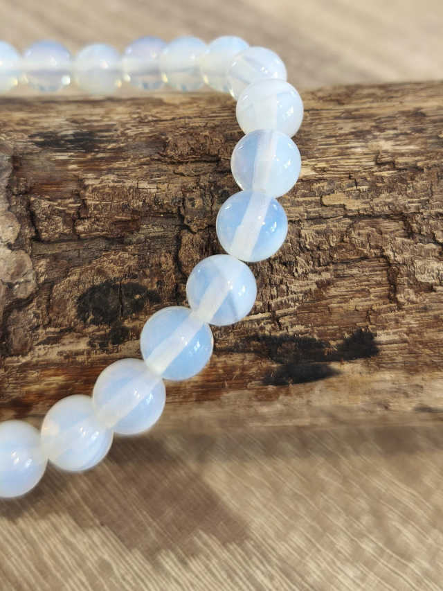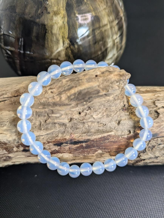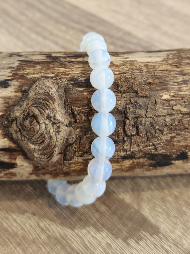 Bracelet en pierres d'opaline monté sur un élastique blanc.