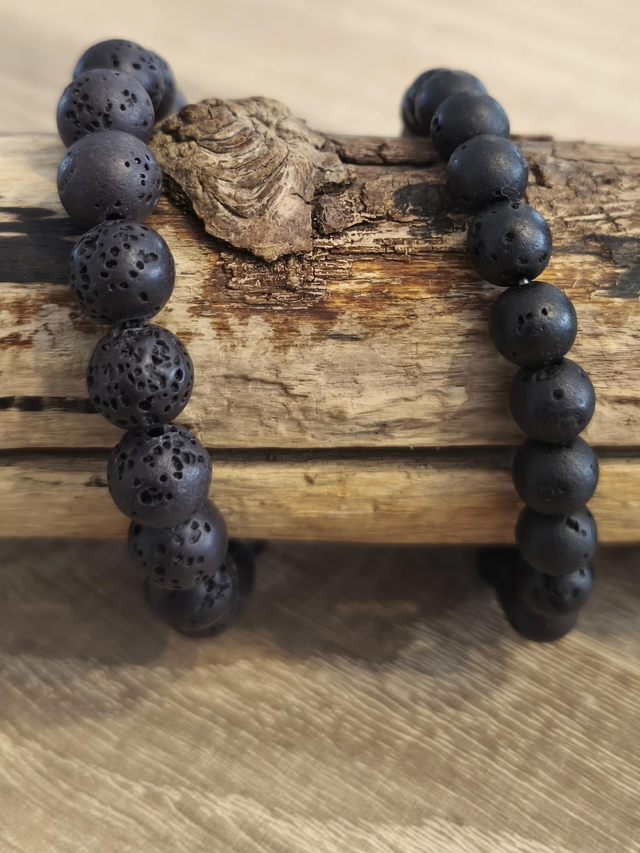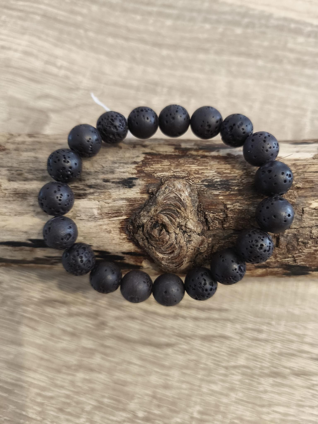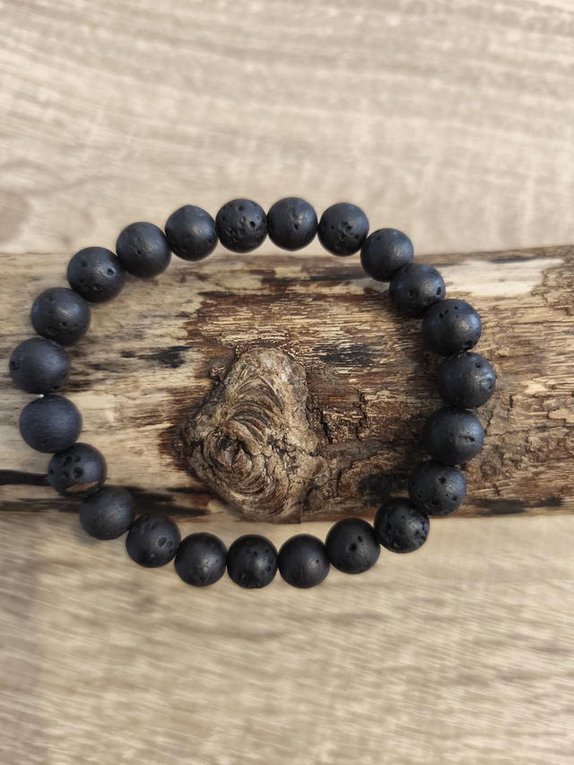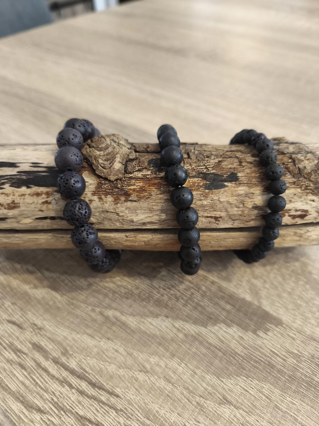 Bracelet en pierres de lave naturelles monté sur un élastique noir.