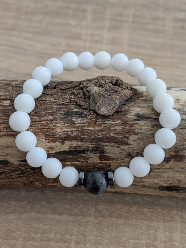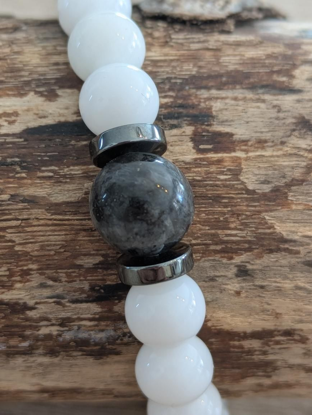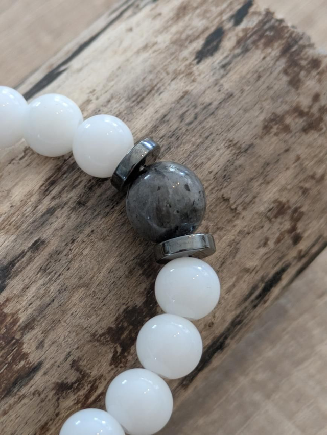 L'agate blanche alliée à la puissance de la labradorite apporte détermination et confiance en soi. Cette combinaison de pierres puissantes éloigne les énergies négatives, apportant stabilité et ancrage solide.