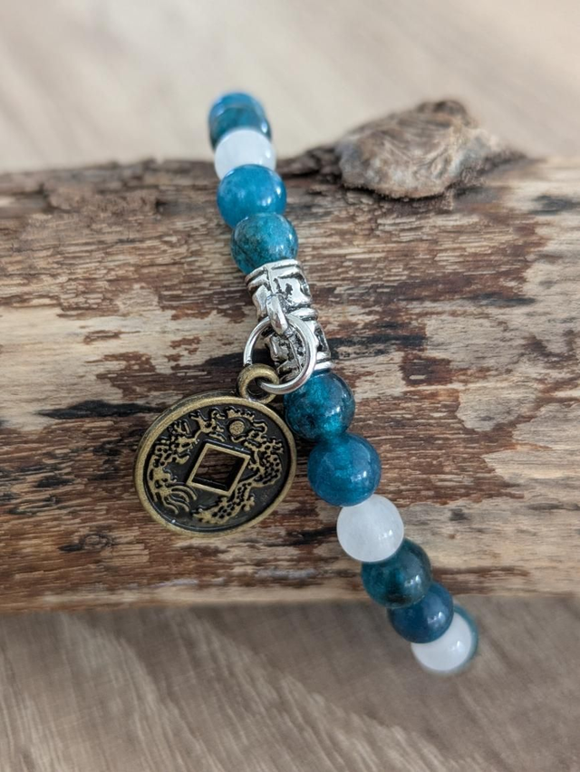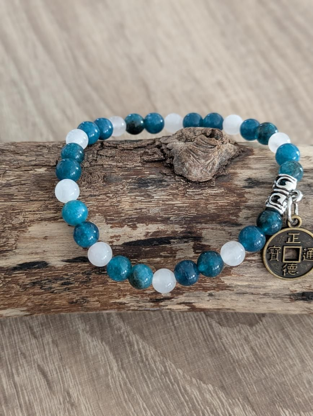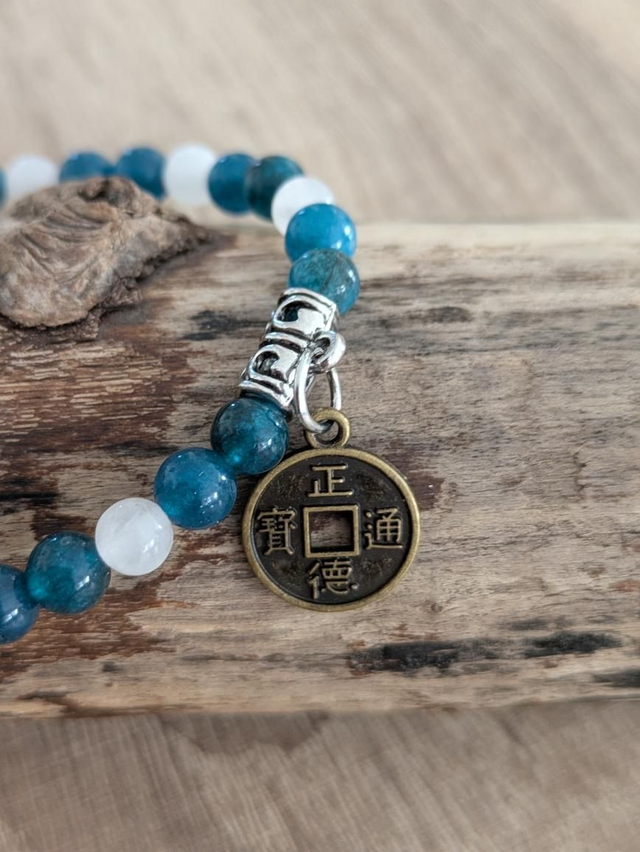 Bracelet création composé de perles d'apatite et de pierre de lune. Deux pierres aux vertus apaisantes pour vous apporter sérénité et calme