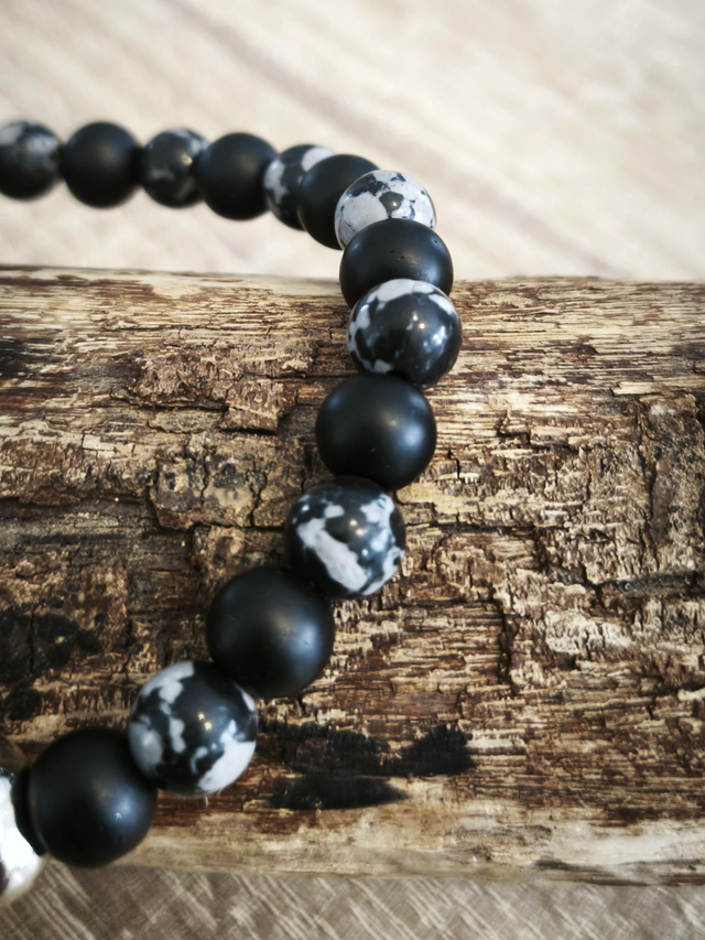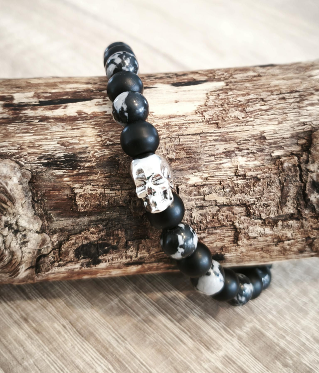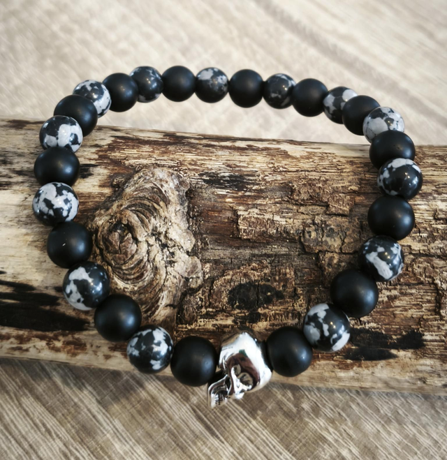 Bracelet original monté sur un élastique noir et composé de pierres d'obsidienne flocon de neige, onyx noir mat et une décoration tête de mort argentée.