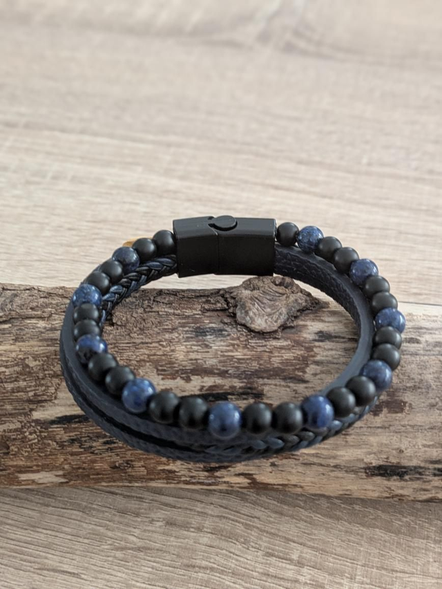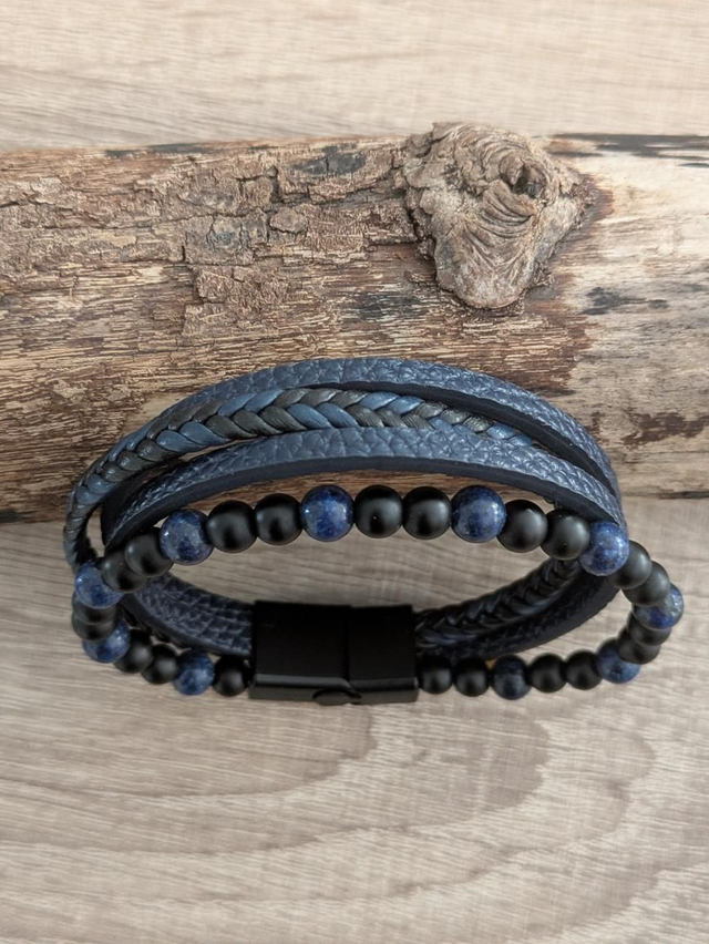 Bracelet en cuir PU bleu, pierres d'onyx et lapiz lasuli