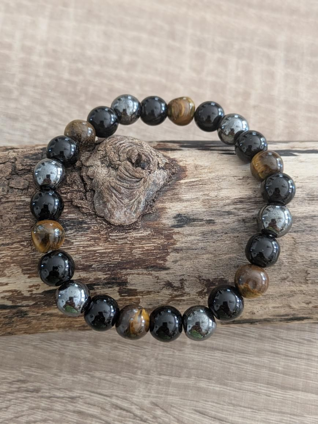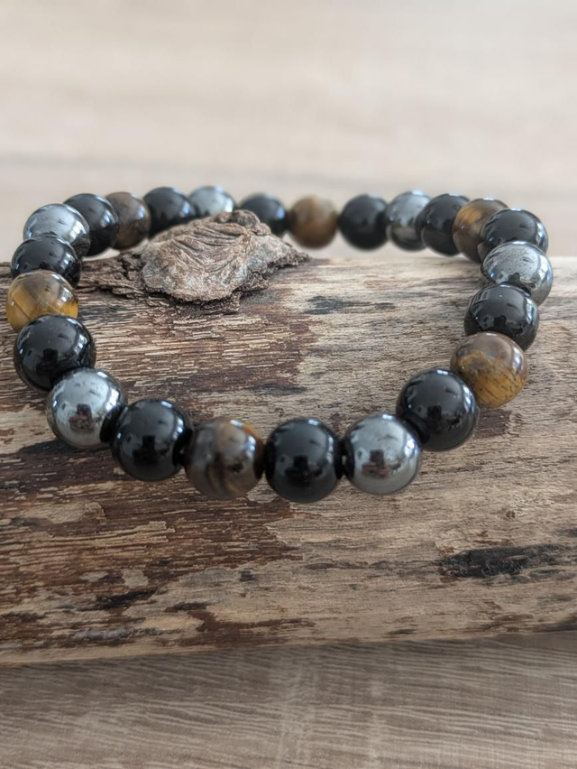 Bracelet composé d'un trio de pierres puissantes de protection : oeil de tigre, hématite et obsidienne