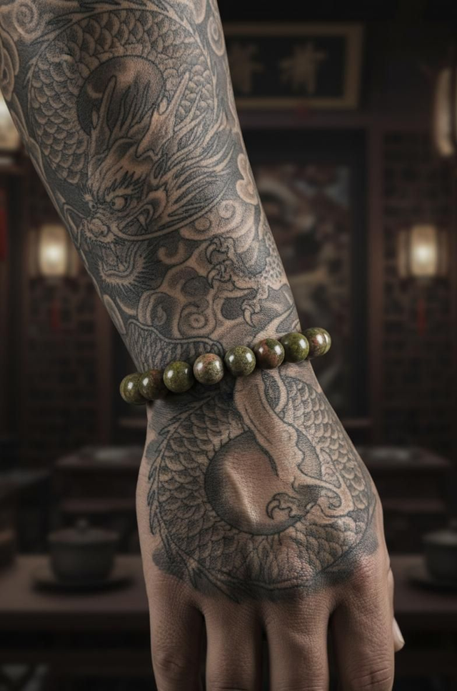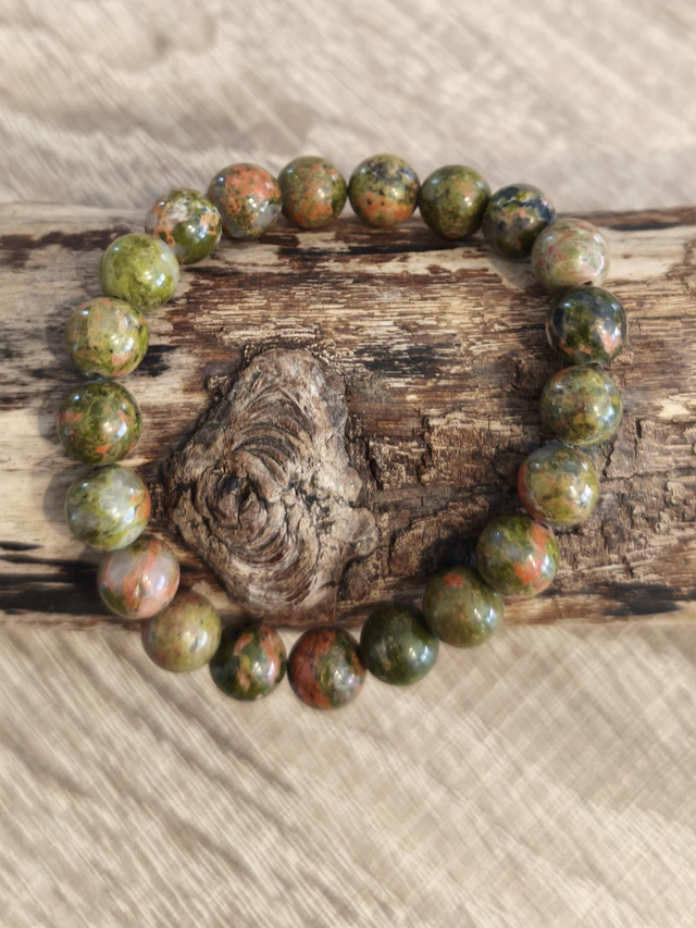 Bracelet en pierres naturelles d'unakite monté sur un élastique. Les pierres sont opaques aux magnifiques couleurs verte, orange, rose.