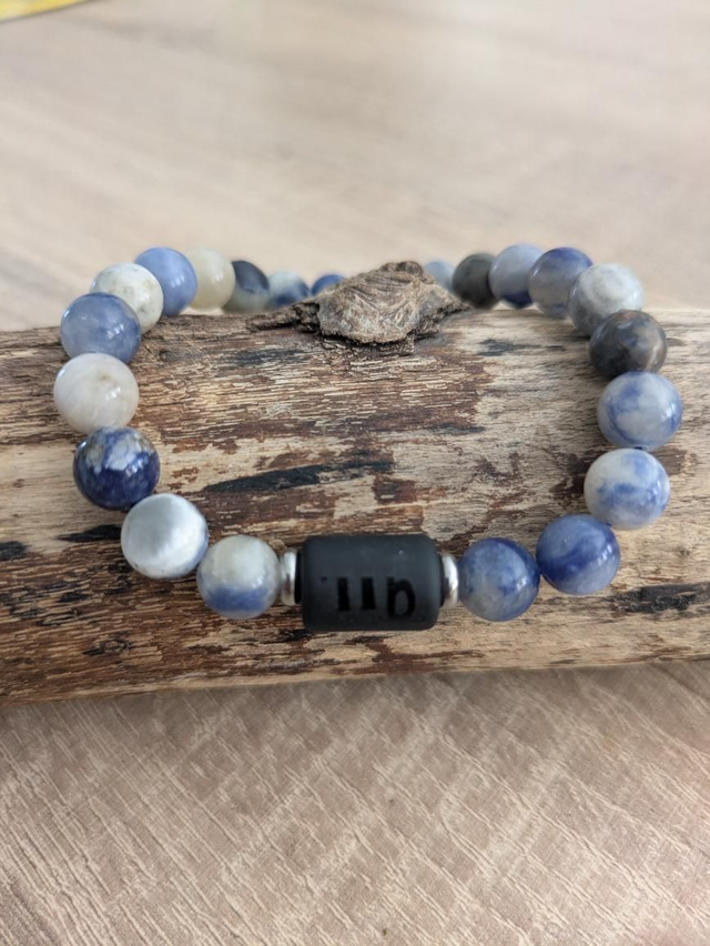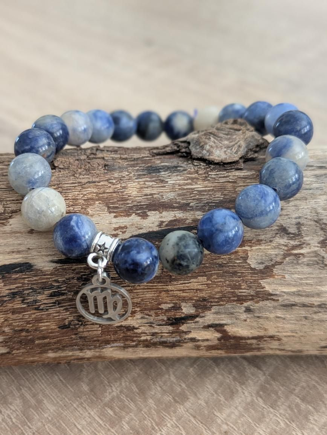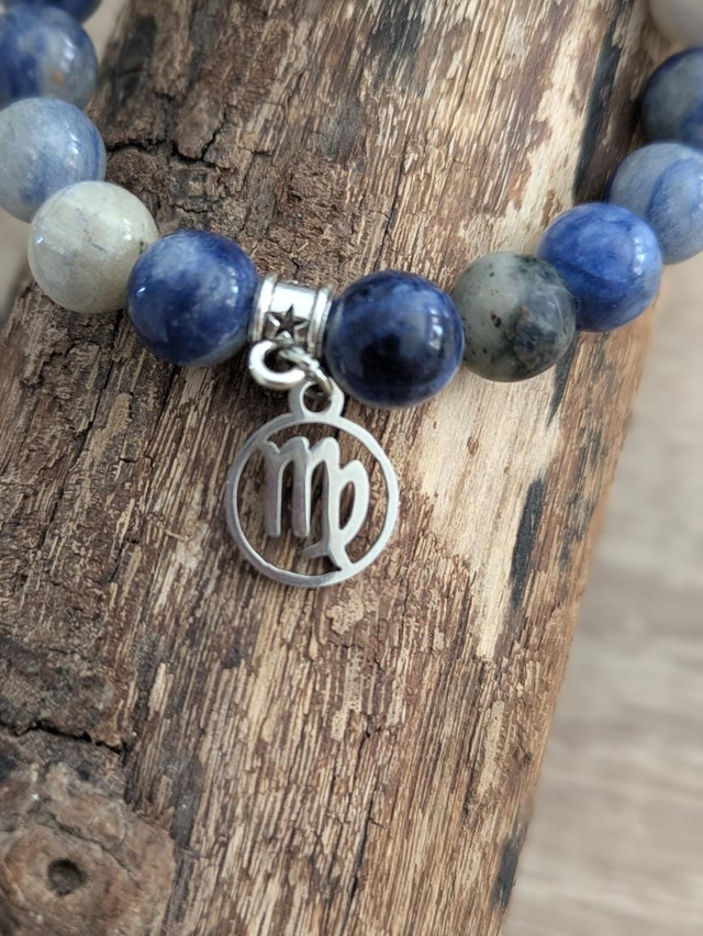 Bracelet en pierres de sodalite avec une décoration du sigle de la vierge au choix : perle noire ou breloque argentée