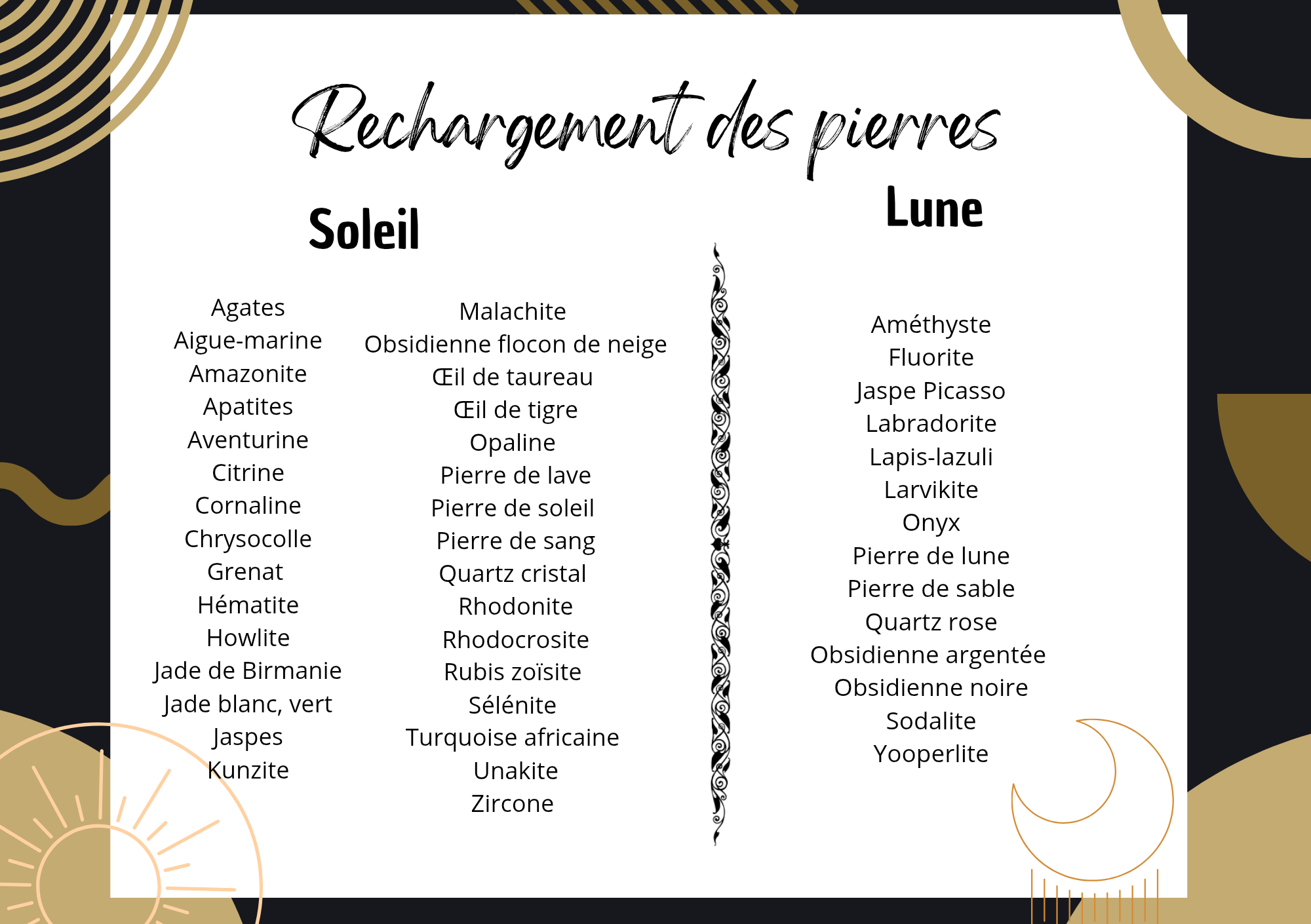 L’exposition à la lune est également fortement conseillée : laissez à l’extérieur votre pierre se recharger pendant la pleine lune ou la nouvelle lune. À ces périodes, il y a en effet une forte attraction énergétique sur les éléments.